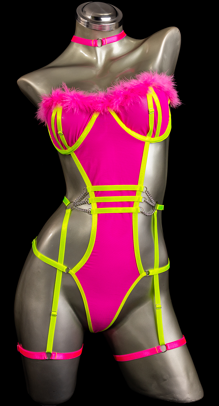 Body color fucsia neón con verde laborado en mallatex con herrajes plateados y tiras corredizas