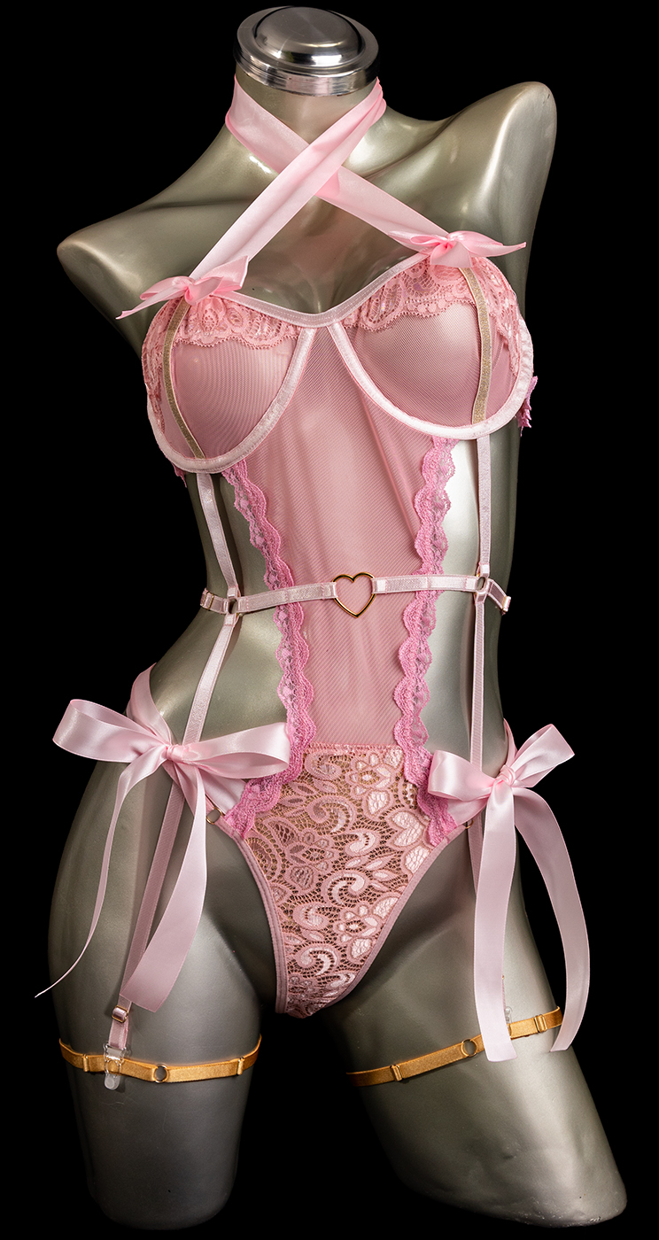 Body color rosa y dorado elaborado en encaje y mallatex con copa varilla talla 34/36, herrajes dorados y tiras corredizas