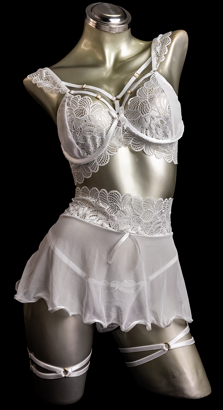 Conjunto interior color blanco elaborado en encaje con herrajes dorados y tiras corredizas