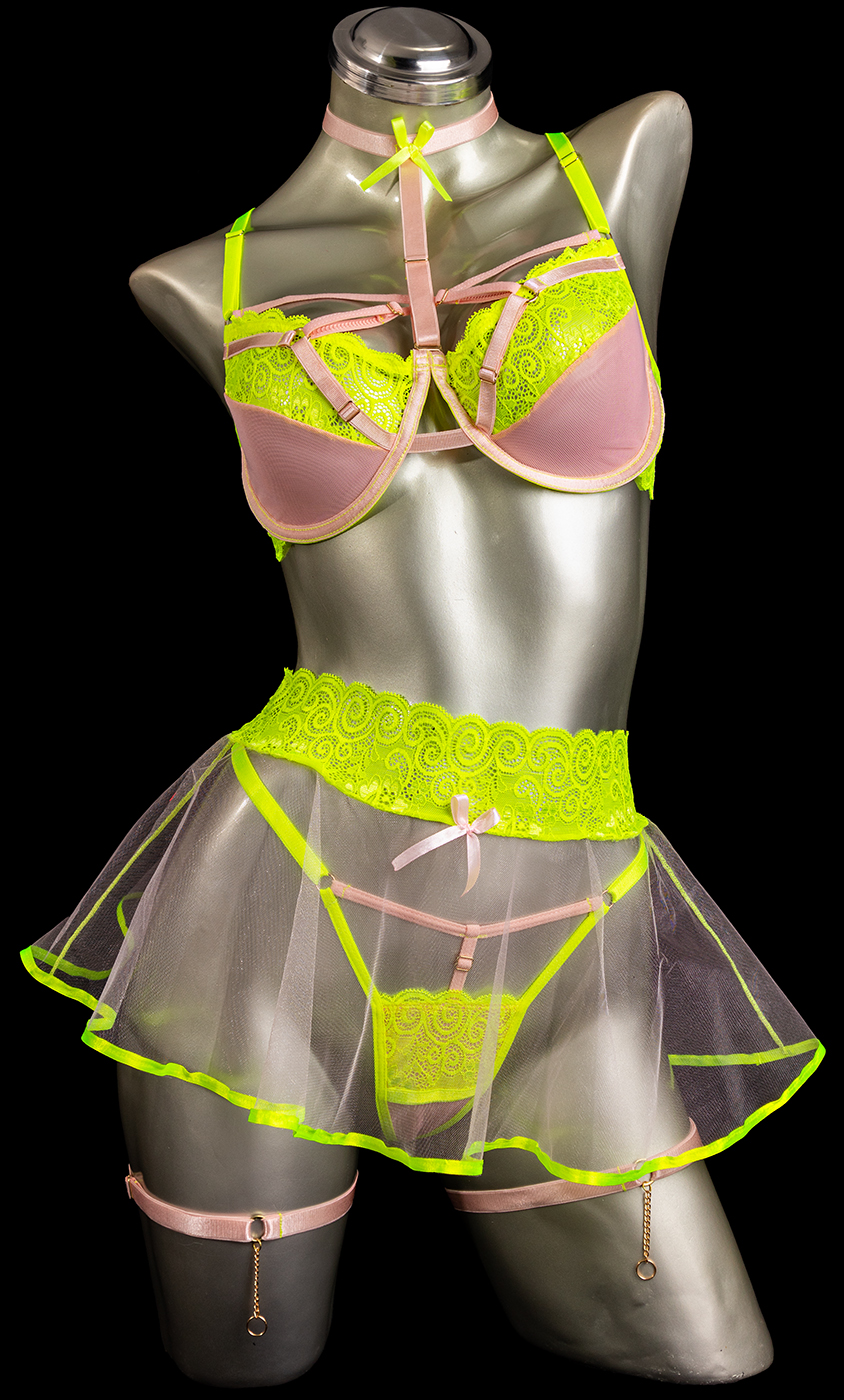 Conjunto interior color verde neón – rosa elaborado en encaje con herrajes dorados y tiras corredizas