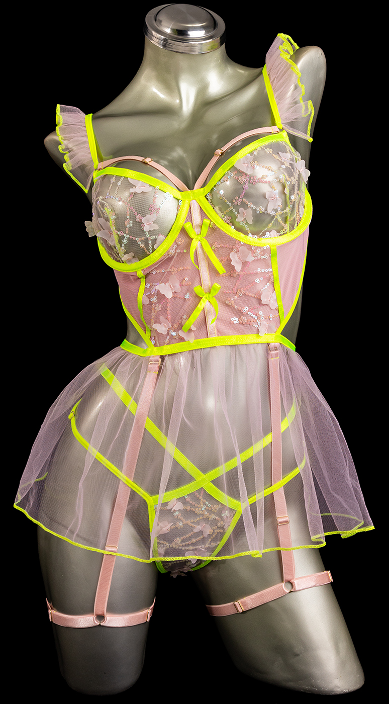 Falda liguero verde-rosa elaborado en bipiur y mallatex con herrajes dorados y tiras corredizas