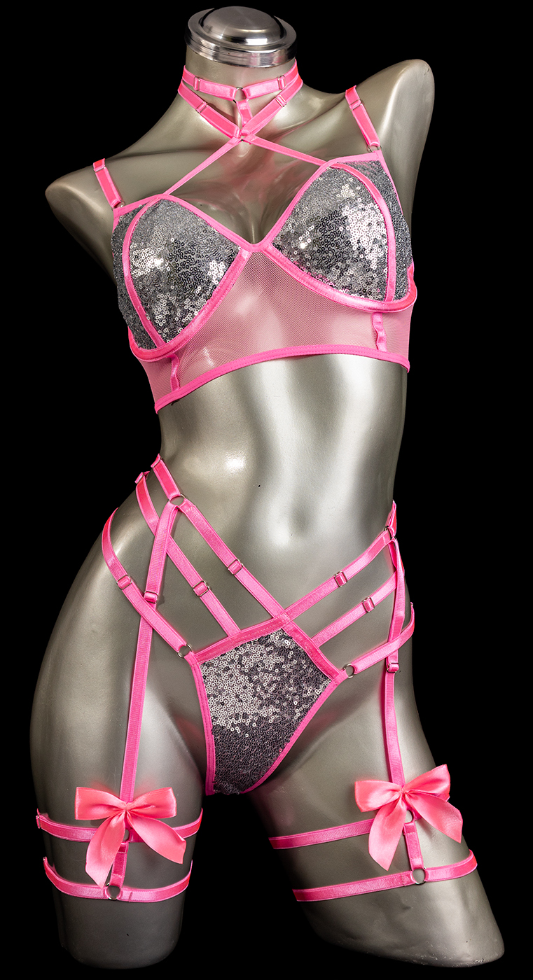 Tanga liguero color rosado elaborado en lentejuelas y mallatex con copa varilla talla 34/36, herrajes plateados y tiras corredizas